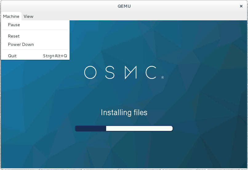 # Create an 1 GiB SD card image from the downloaded OSMC image. $ cat ~/Downloads/OSMC_TGT_rbp2_20160130.img /dev/zero | dd bs=4096 count=262144 >/tmp/osmc.img 262144+0 Datensätze ein 262144+0 Datensätze aus 1073741824 Bytes (1,1 GB) kopiert, 3,15888 s, 340 MB/s # Mount the first partition from the OSMC image. $ sudo kpartx -a /home/stefan/Downloads/OSMC_TGT_rbp2_20160130.img $ sudo mount /dev/mapper/loop0p1 /mnt -o loop,ro # Run QEMU emulation. $ arm-softmmu/qemu-system-arm -M raspi2 -kernel /mnt/kernel.img -append "$(cat /mnt/cmdline.txt)" -usbdevice mouse -usbdevice keyboard -drive file=/tmp/osmc.img,if=sd,format=raw